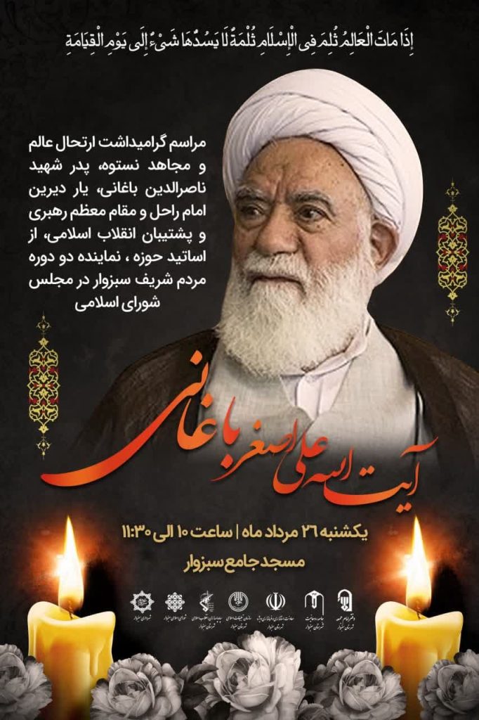 مراسم گرامیداشت عالم ربانی و مجاهد نستوه، بازمانده ی حادثه ی تروریستی حزب جمهوری در هفتم تیر ماه و پدر شهید ناصرالدین باغانی، مرحوم آیت الله علی اصغر باغانی روز یکشنبه بیست و ششم مرداد ماه 1404 با حضور حضرت آیت الله مغیثه عضو محترم مجلس خبرگان رهبری و امام جمعه ی سبزوار، آیت الله حسینی نماینده ی دفتر آیت الله علم الهدی امام جمعه ی محترم مشهد مقدس، دکتر قربانی معاون محترم استاندار و فرماندار ویژه ی شهرستان سبزوار، دکتر محسنی ثانی نماینده ی مردم شریف سبزوار در مجلس شورای اسلامی، علما و روحانیون، مدیران دستگاه های اجرایی، نیروهای نظامی و انتظامی و مردم مؤمن و شهیدپرور سبزوار از ساعت 10:30 صبح در مسجد جامع سبزوار برگزار شد.