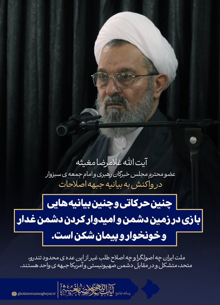 حضرت آیت الله مغیثه عضو محترم مجلس خبرگان رهبری و امام جمعه ی سبزوار با اشاره به بیانیه ی یک جبهه ی سیاسی در خصوص اتفاقات سیاسی اخیر در خطبه های نماز جمعه ی این هفته: احزاب مختلفی از این جریان نسبت به انتشار چنین بیانیه ای موافقت نداشتند و برای انتشار این بیانیه در درون آن جبهه اختلافات جدی بوده و اجماعی صورت نگرفته است.