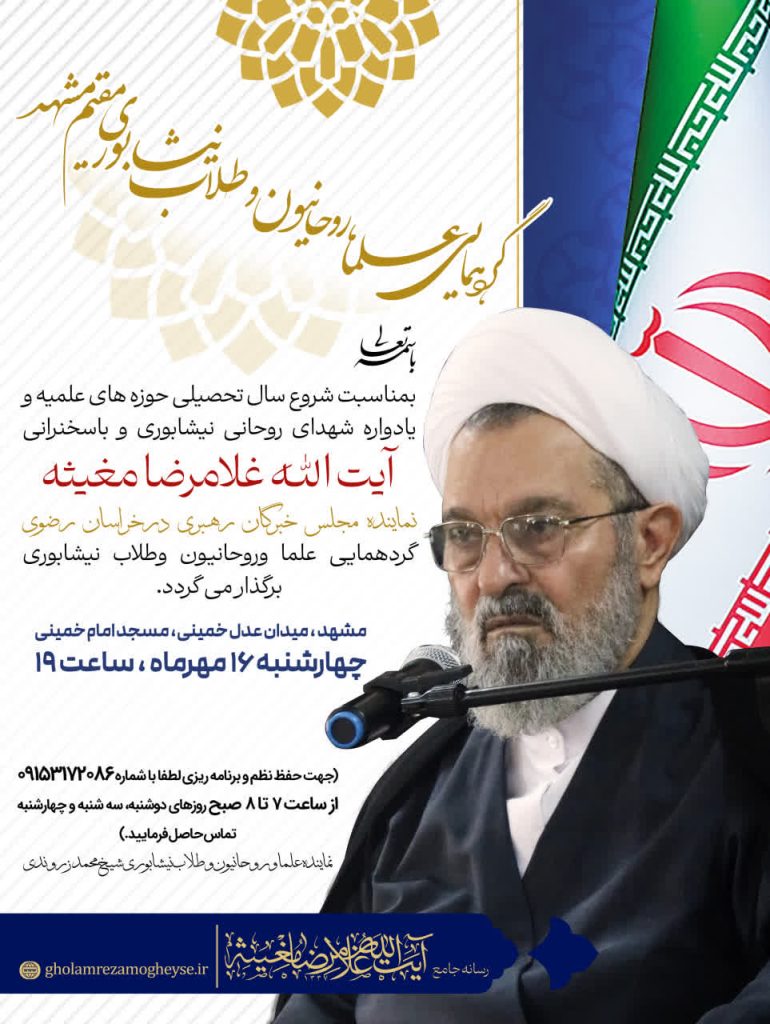 ⭕️ گردهمایی علما و روحانیون وطلاب نیشابوری مقیم مشهد 💢بمناسبت شروع سال تحصیلی حوزه های علمیه و یادواره شهدای روحانی نیشابوری و با سخنرانی: آیت الله غلامرضا مغیثه نماینده مجلس خبرگان رهبری درخراسان رضوی گردهمایی علما و روحانیون وطلاب نیشابوری برگذارمی گردد. 📌مکان: مشهد مقدس، میدان عدل خمینی، مسجد امام خمینی ⏰زمان: چهارشنبه ۱۶ مهرماه […]